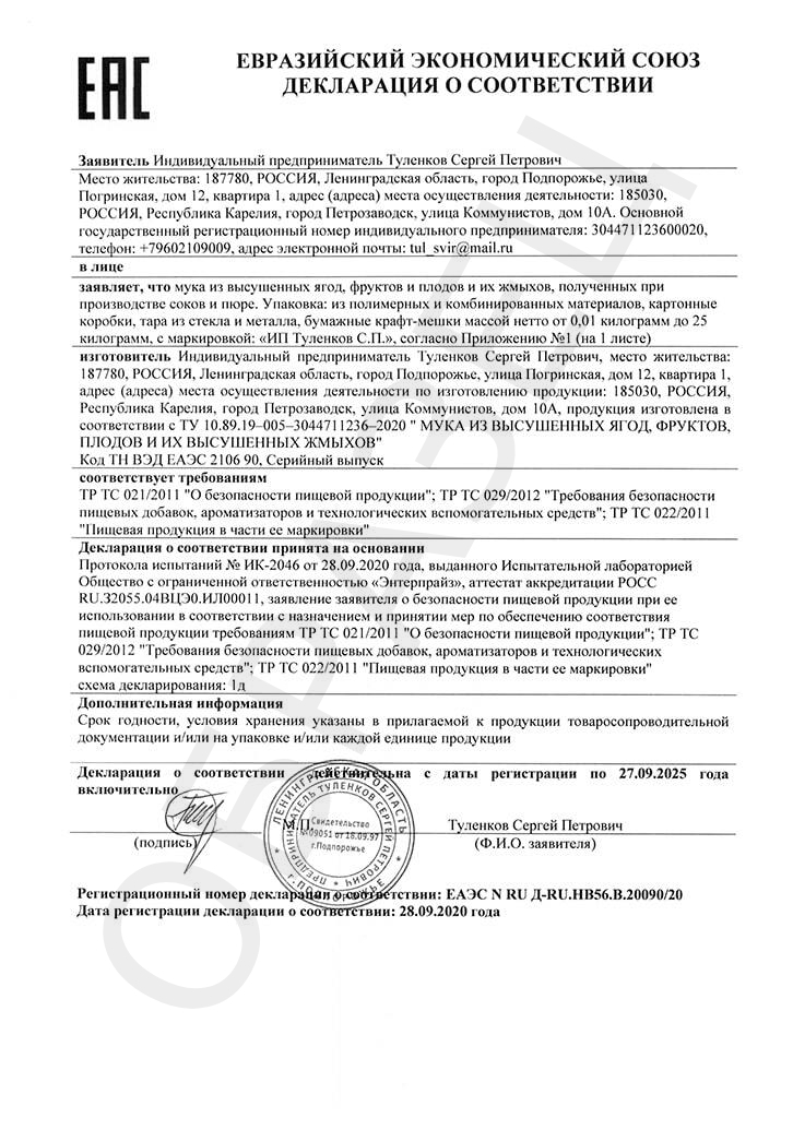 Наша компания занимается оптовой реализацией муки из ягод и фруктов по всей территории России. Вся наша продукция проходит обязательную сертификацию. Наша цель предоставить вам продукт отличного качества по лучшей цене и в кратчайшие сроки.